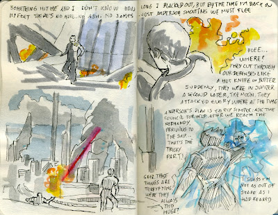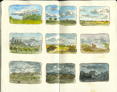 After a superb presentation by Jorge Arranz, I had been wanting to draw the view out of a train window and last saturday I had the chance of watching the sunset from the Malaga-Sevilla train. Better yet, my friend Ubalio Martínez did this wonderful composition of myself drawing the 9 vignetes on the go. His photo actually looks better than my drawing, so I'm including it here :)